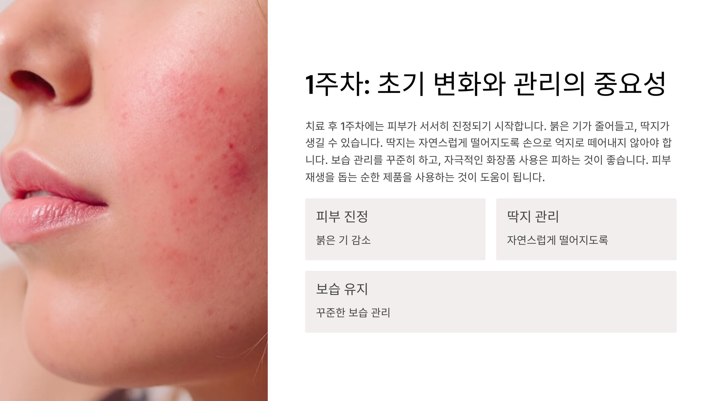 2. **보습**을 철저히 관리하세요. 피부가 건조하면 각질이 생기고 회복 속도가 느려질 수 있어요.