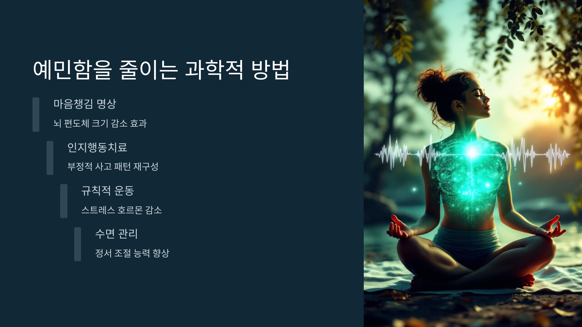 즉, 예민한 사람들은 감정을 담당하는 뇌 부위가 더 활발하게 작동하거나, 감정을 조절하는 부위가 비효율적으로 기능하는 경우가 많아요. 하지만 이건 단점만 있는 게 아니에요! 다음 섹션에서 예민함을 조절하는 과학적인 방법을 소개할게요! 😉