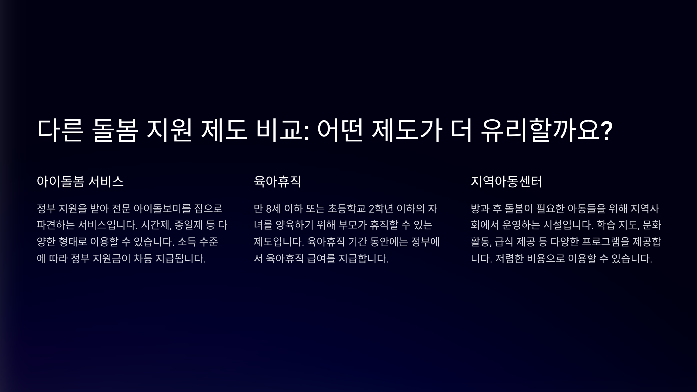 | 아이돌봄 서비스 | 전문 돌보미가 가정 방문 | 시간당 비용 부담, 맞벌이 가정 우선 |
