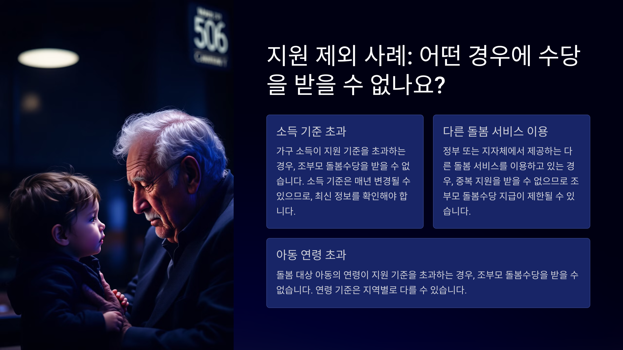 조부모 돌봄수당을 받을 수 없는 사례도 있어요. 주요 제외 조건을 살펴볼까요?