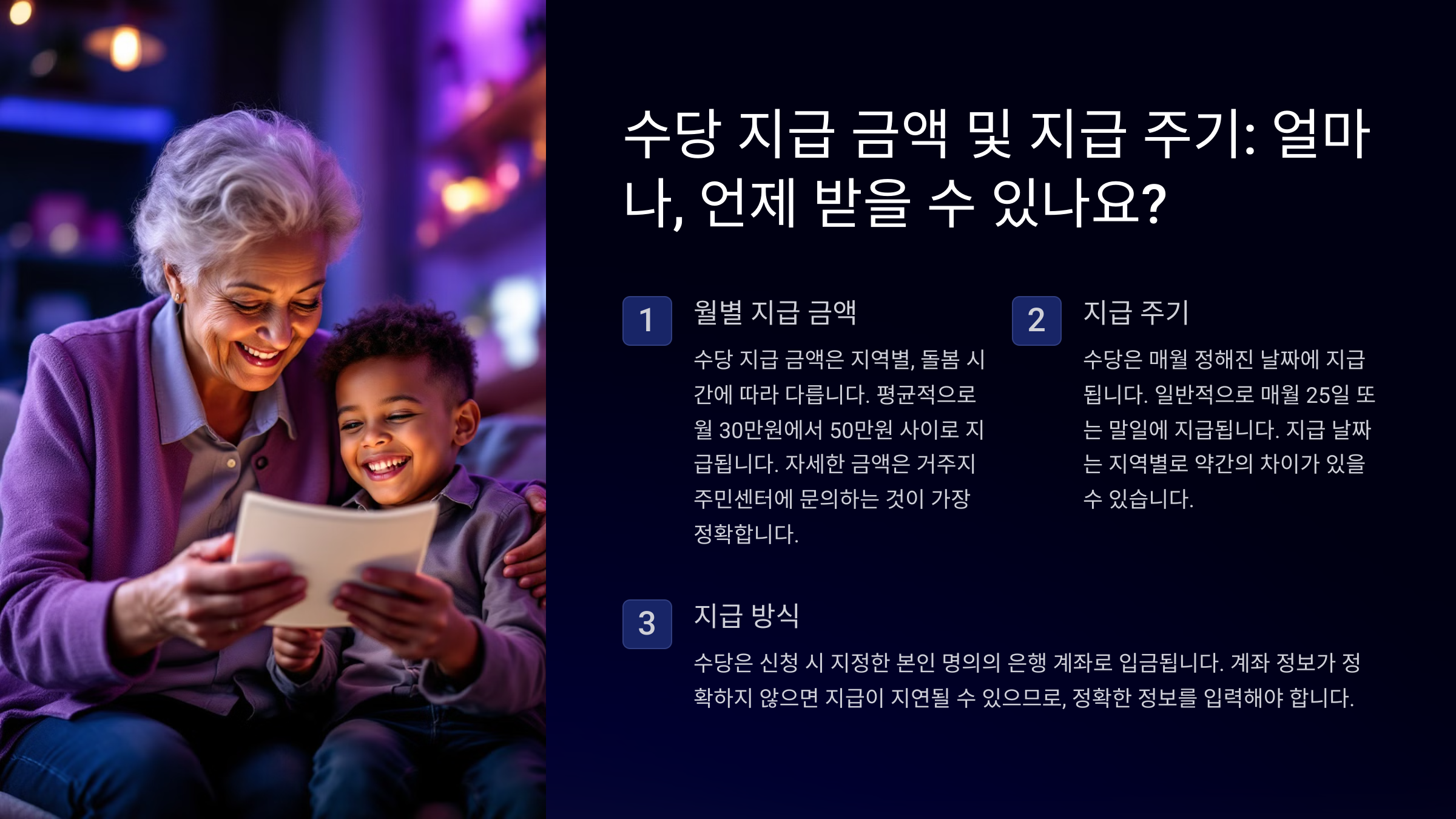 🕰️ 돌봄 시간 기준: 일부 지역에서는 조부모가 하루에 몇 시간 이상 돌봄을 제공하는 경우에만 지급하는 기준이 적용되기도 해요. 예를 들어 하루 4시간 이상 돌보는 조건이 있는 경우도 있답니다.