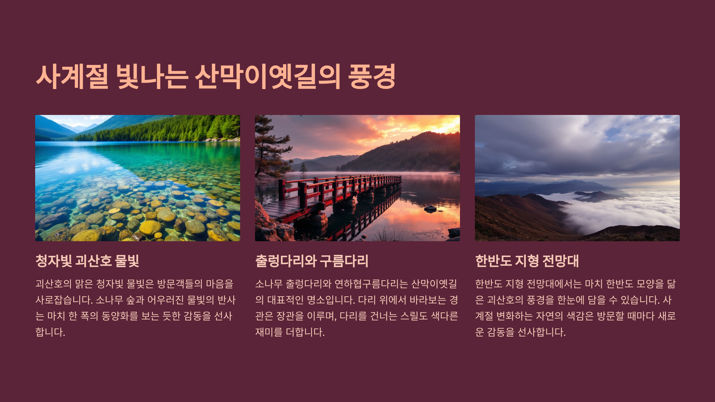 다음은 산막이옛길의 아름다운 풍경과 매력을 좀 더 자세히 살펴볼게요! 👀