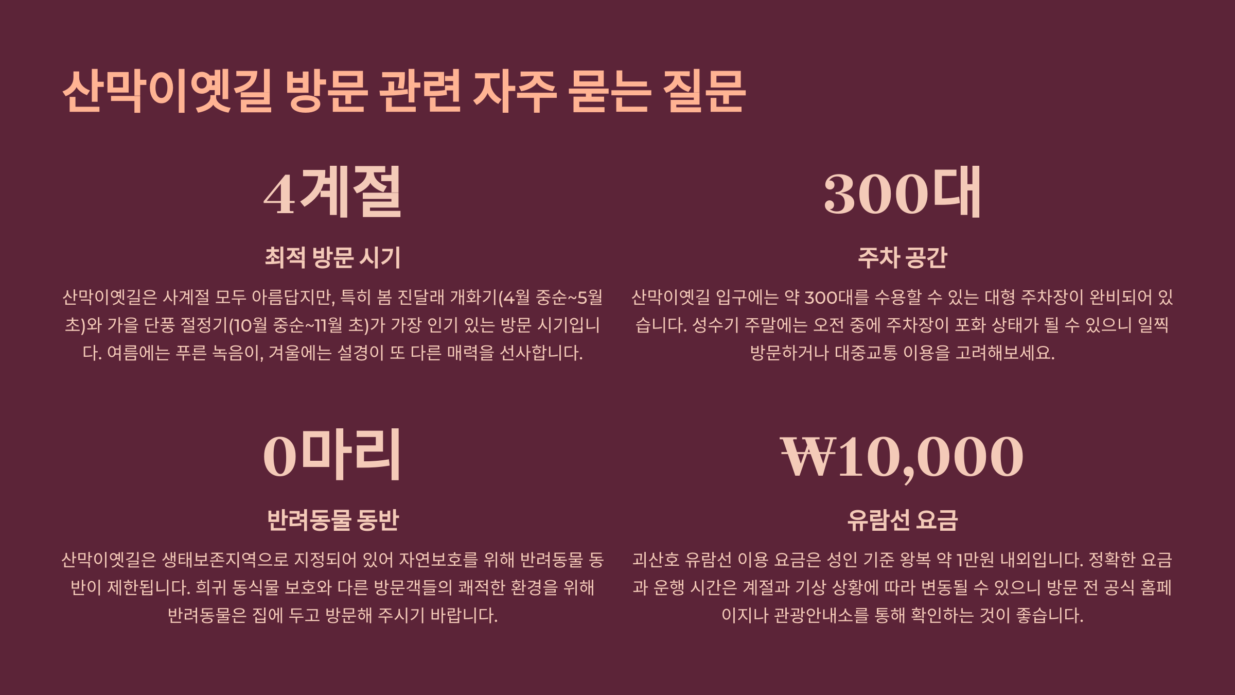 이제 산막이옛길에 대해 궁금한 점을 정리한 FAQ를 확인해볼까요? 💡