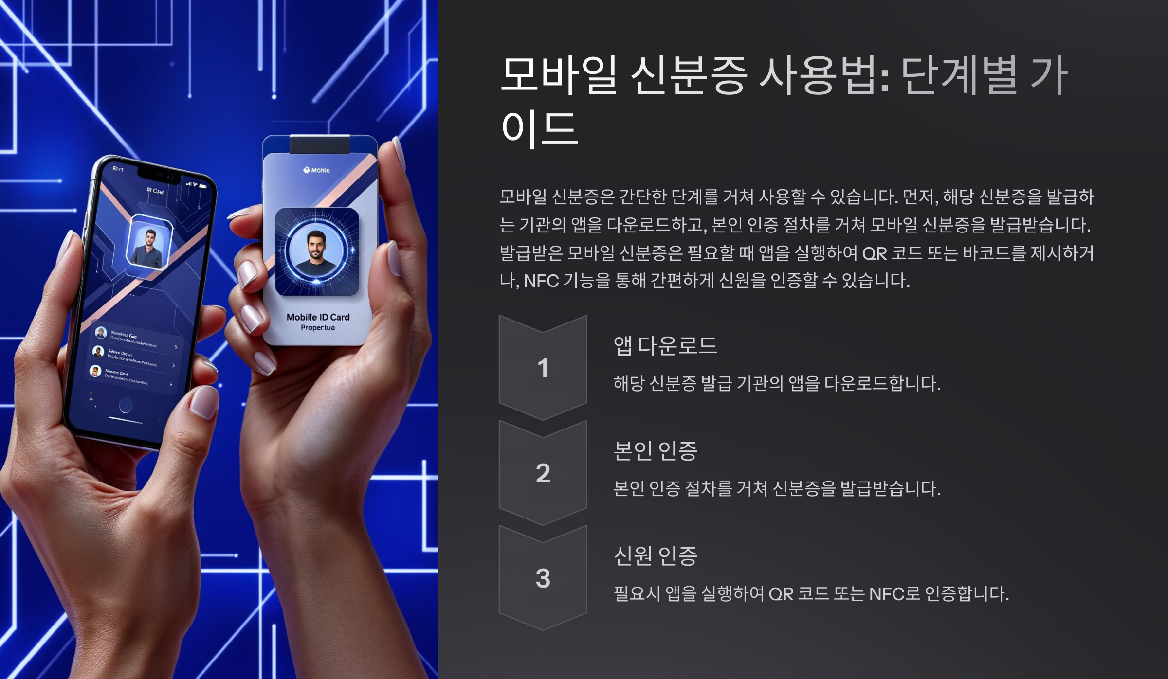 📱 모바일 신분증은 스마트폰을 이용해 신원을 인증할 수 있는 디지털 형태의 신분증이에요. 기존의 주민등록증, 운전면허증 등을 모바일로 변환해 사용할 수 있도록 한 서비스죠. 이제 더 이상 실물 신분증을 들고 다닐 필요 없이, 스마트폰만 있으면 신원 확인이 가능하답니다.